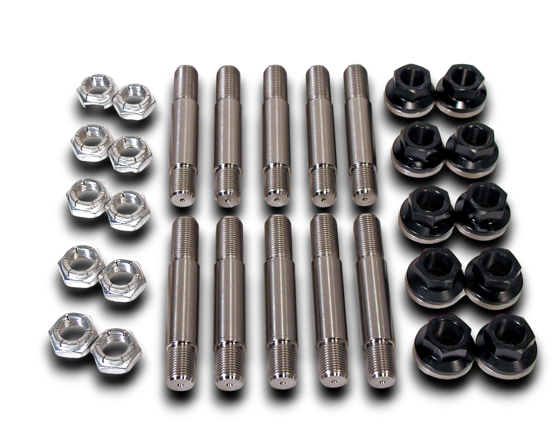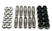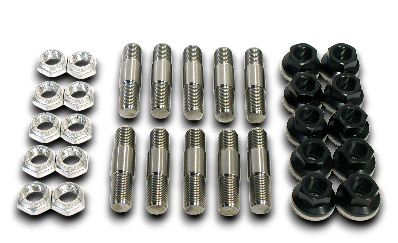 The titanium drive stud is designed so the 11/16" diameter shoulder on the stud is used to center the wheel, rather than the lug nut used with smaller studs. This system dramatically increases shear strength and eliminates bent wheel studs. These studs require 5/8"-18 threaded holes in the axle flange. Studs are then secured in the flange with a jam nut. Wheels are held in place with an encapsulated lug nut made of 7075 aluminum alloy with an anodized hard coat finish. The integral aluminum washer snaps on to the nut and spins freely, but will not separate from the nut, preventing accidental loss. The nuts have a fixed counter bore depth of 1/8" or 3/8" that make them equivalent to using a standard nut and washer combination of equal thickness.