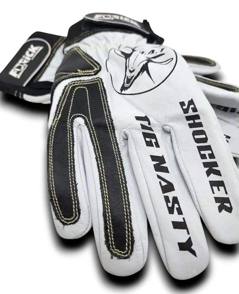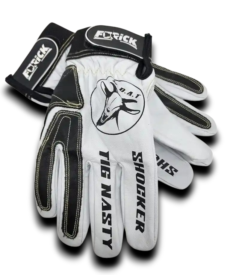 Furick Shocker/ Tignasty Tig glove.  The next model  in the Shocker Lineup features and pure White glove with Black Doublers. This glove is constructed in Quality Goat Skin . The Leathers quality is evident as soon as you slide your hand and strap it on .