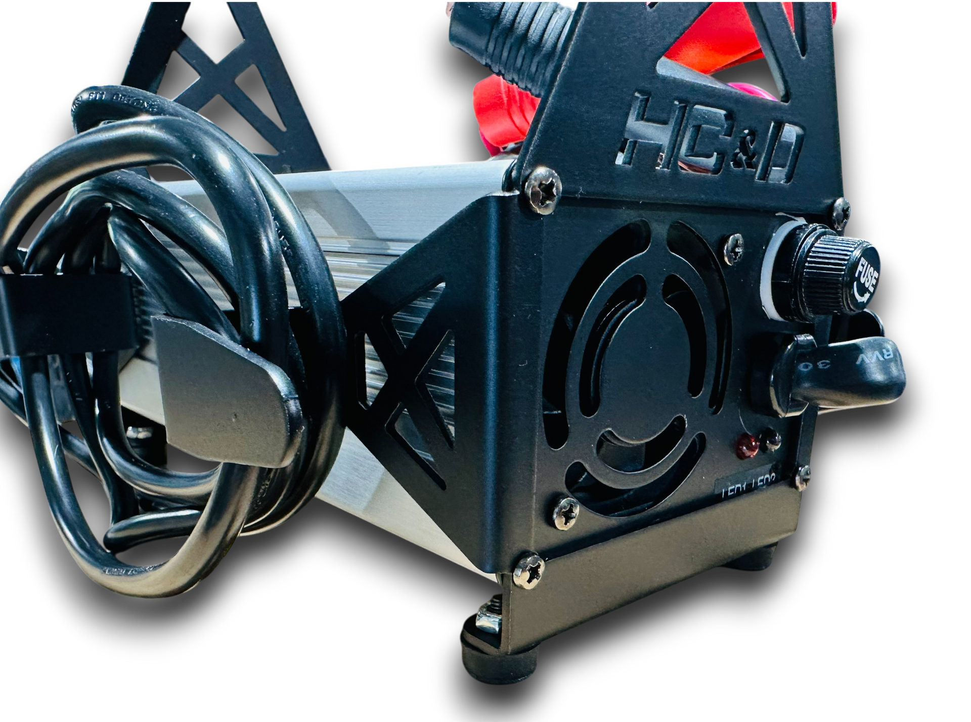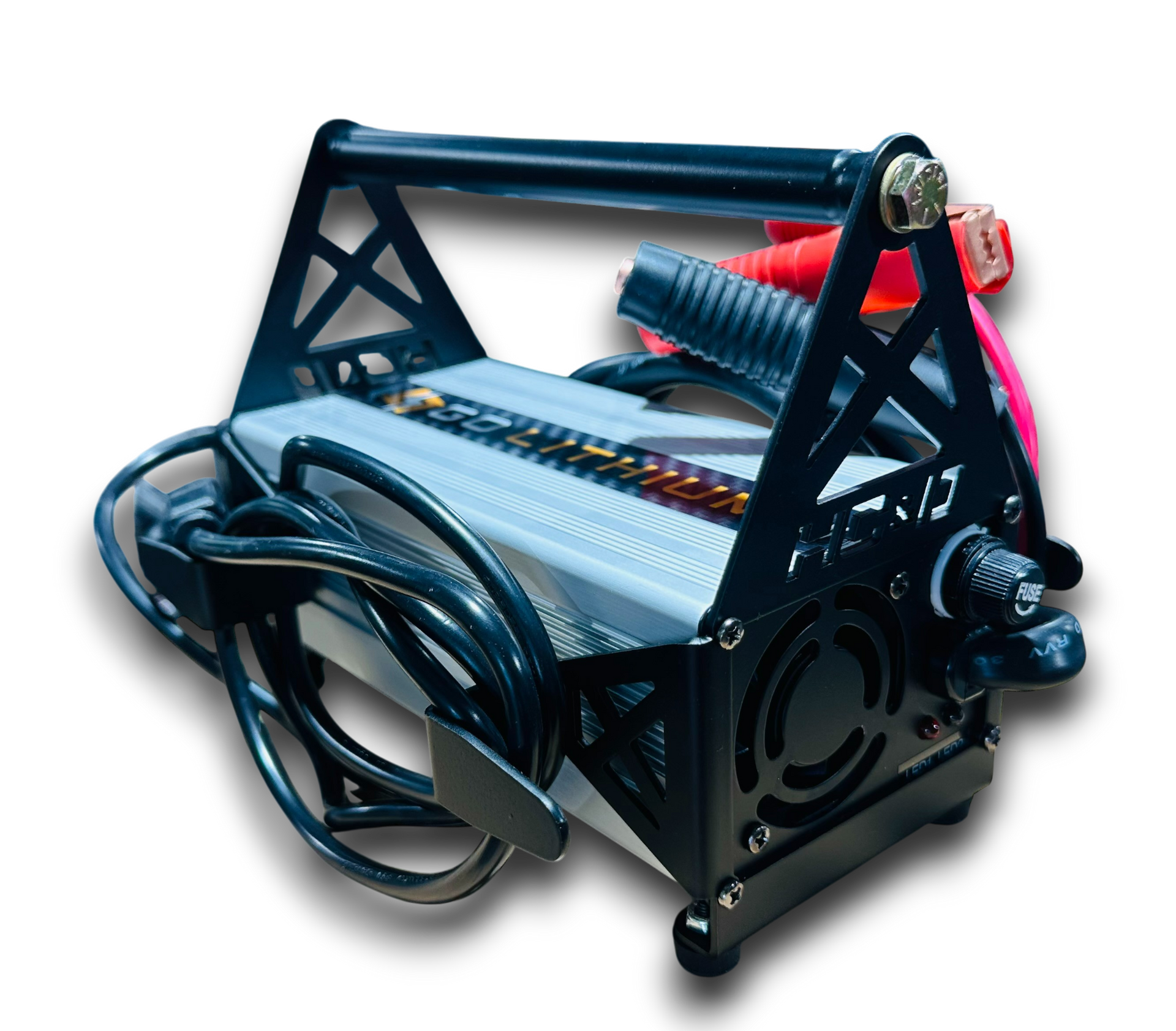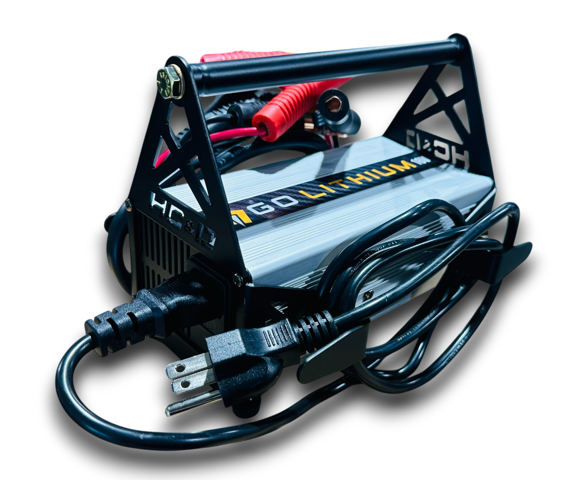 Enhance your experience with the Go-Lithium 16v battery charger using our dedicated holder. Designed with rubber bumper feet and dual cable wraps, it ensures stable placement and organized, hassle-free storage.
