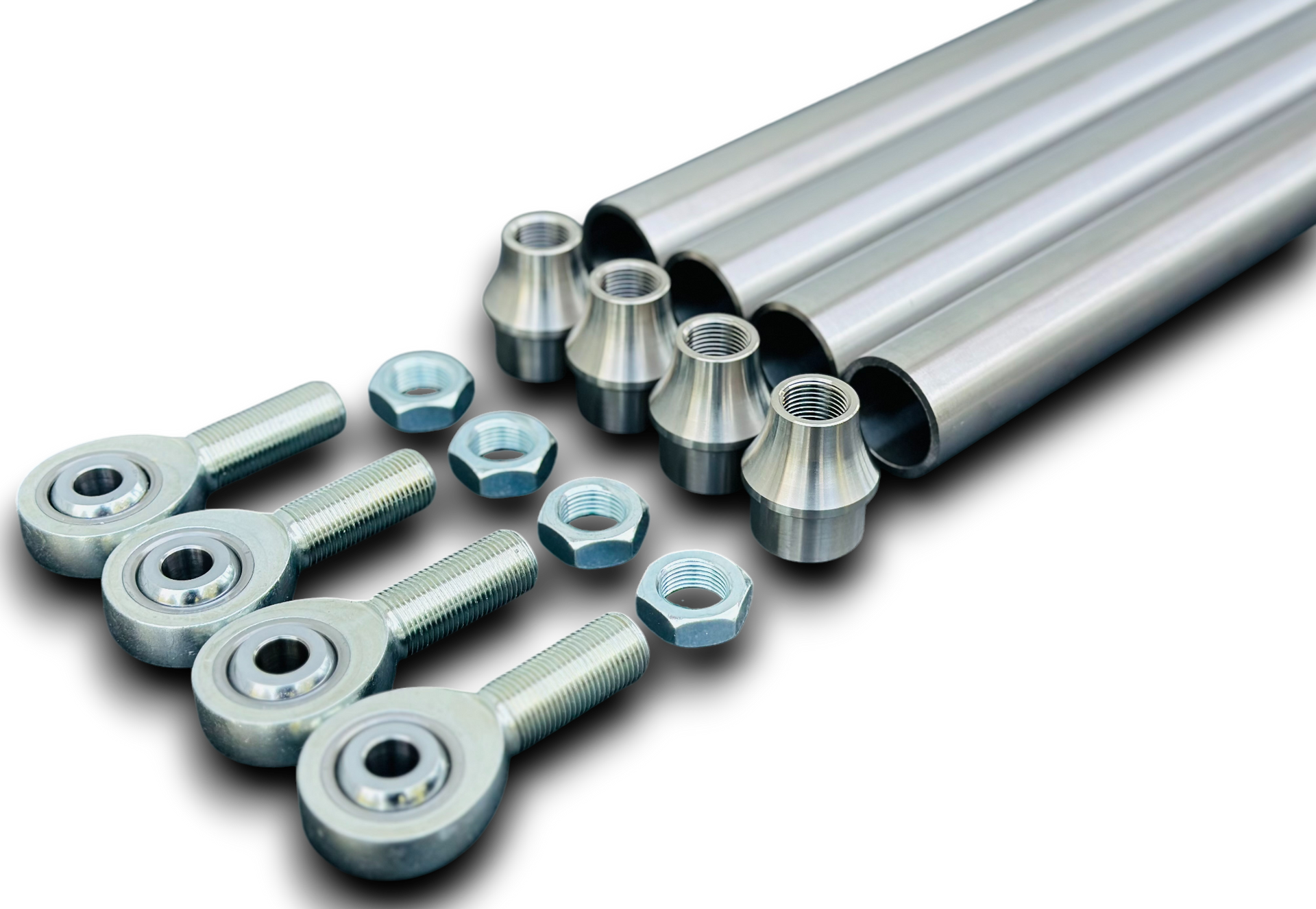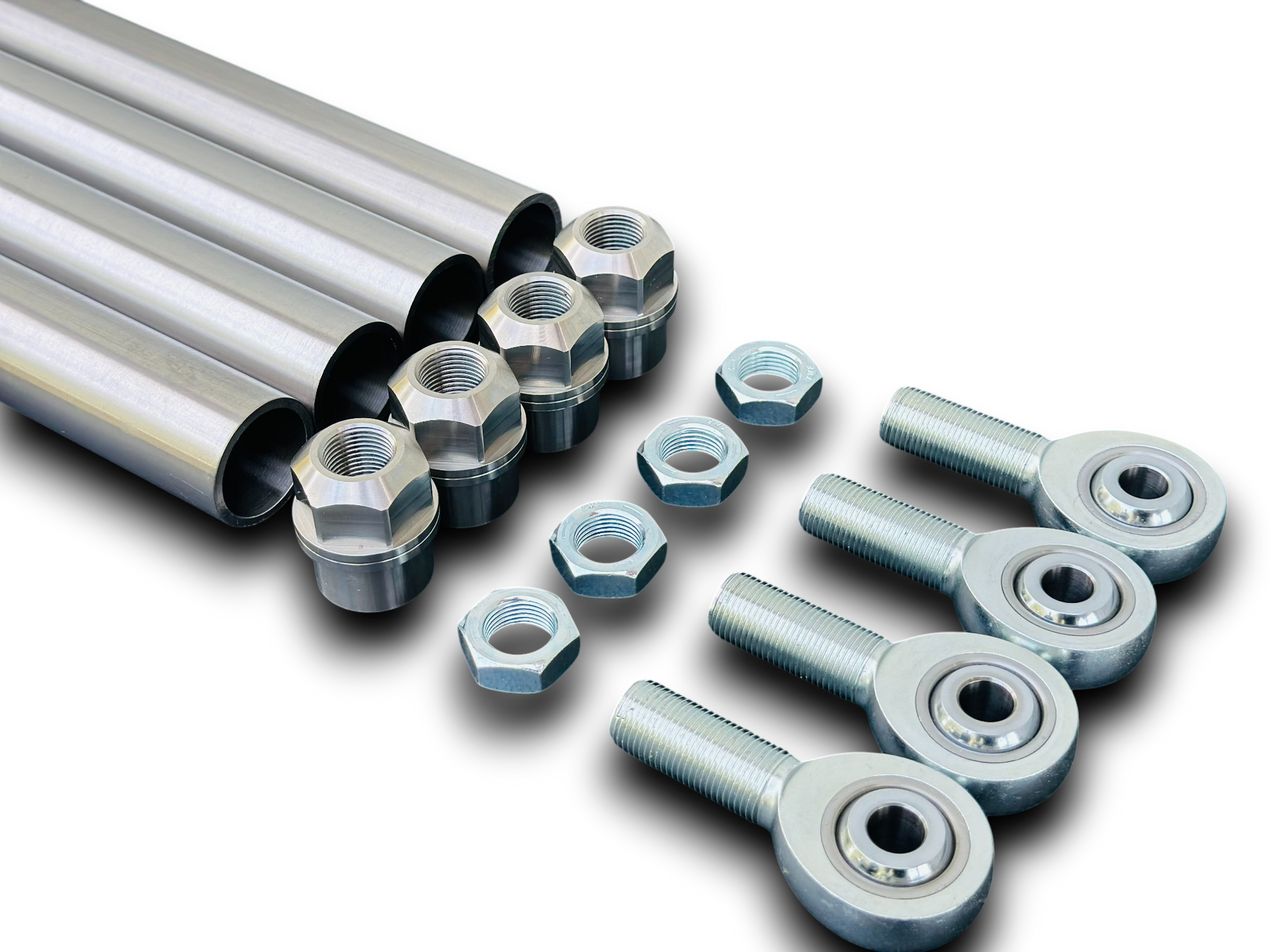 Our titanium 4 link bars deliver both strength and reduced weight. Crafted from a sturdy 1 1/2" x .125" wall grade 9 titanium tube, they feature precisely machined tube adapters with a light press fit, along with high-quality rod ends. These bars are approximately one-third lighter than our heavy-duty 4130 steel counterparts, offering significant weight reduction. These can be purchased as a kit or assembled to your length specs.