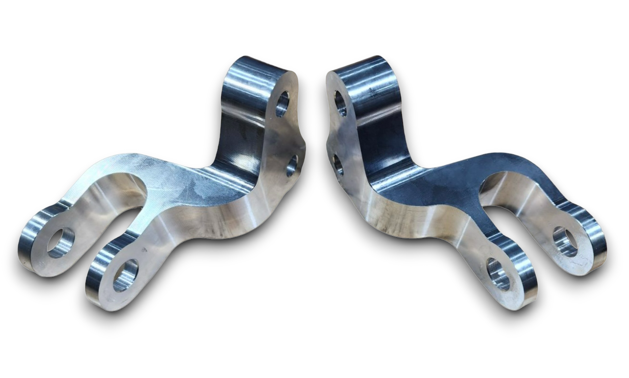 These billet shock mounts work with all of our 4 link brackets and stock suspension coil over brackets. Made with 1.5" offset to step the shock inboard to align with frame rails when using our splined ARBs that mount to top of the housing 4 link bracket. We made the shock eyelet slot longer than our competitors to resolve known clearance issues. These are 1/3 lighter than our series I billet shock mounts!